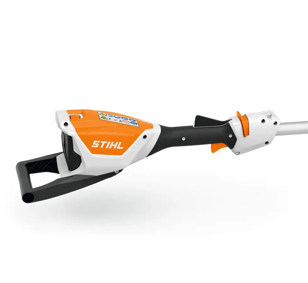 Poignée de contrôle : Le HLA 56 se démarre via le levier de verrouillage (orange), le levier ERGO (noir) et le levier de vitesse (orange en dessous). Le levier de verrouillage est à réarmement automatique et empêche toute mise en marche involontaire de l’appareil. Lorsque le levier ERGO et le levier de vitesses sont enfoncés, le fonctionnement en continu est possible.