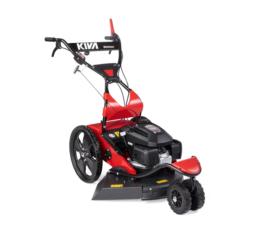 La tondeuse débroussailleuse Kiva Minimax+ avec moteur Honda GCVx200 offre 2 vitesses avant (2,8 et 3,8 km/h) pour un contrôle optimal sur herbes hautes jusqu’à 70 cm et petites broussailles (20 mm). Largeur de coupe de 51 cm, différentiel à taquets et roues avant pivotantes/blocables assurent maniabilité et stabilité. Guidon réglable/démontable et entraînement direct de lame pour puissance et précision en entretien intensif.